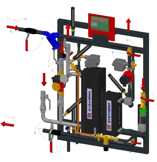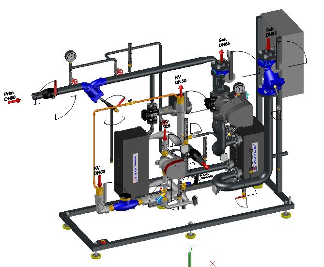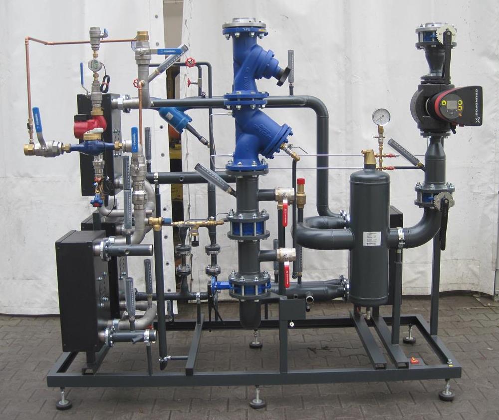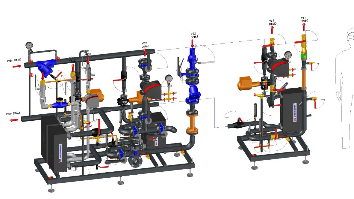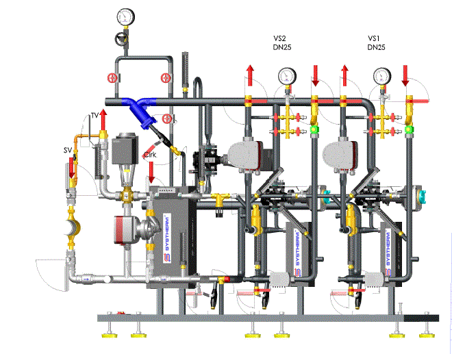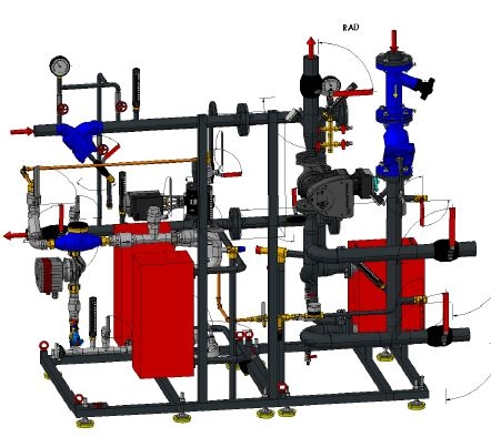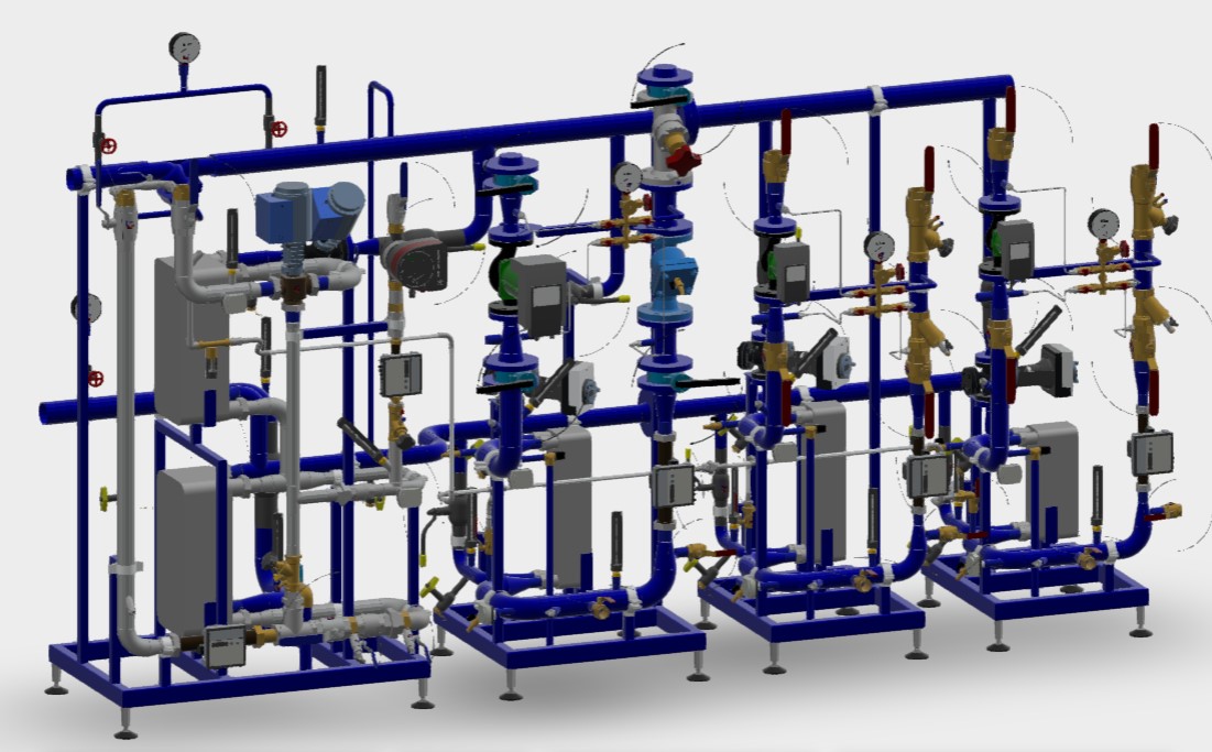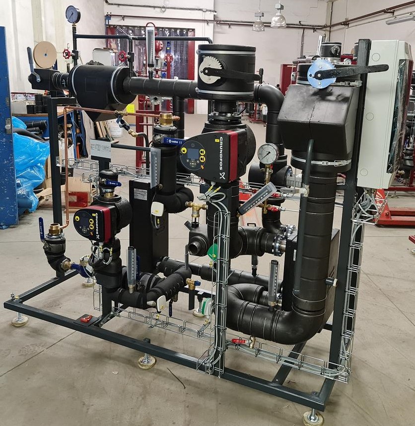 fjärrvärmecentraler med flera kretsar görs i delat utförande på separata ramar och rörledningar med flänsar för sammansättning på byggarbetsplatsen.